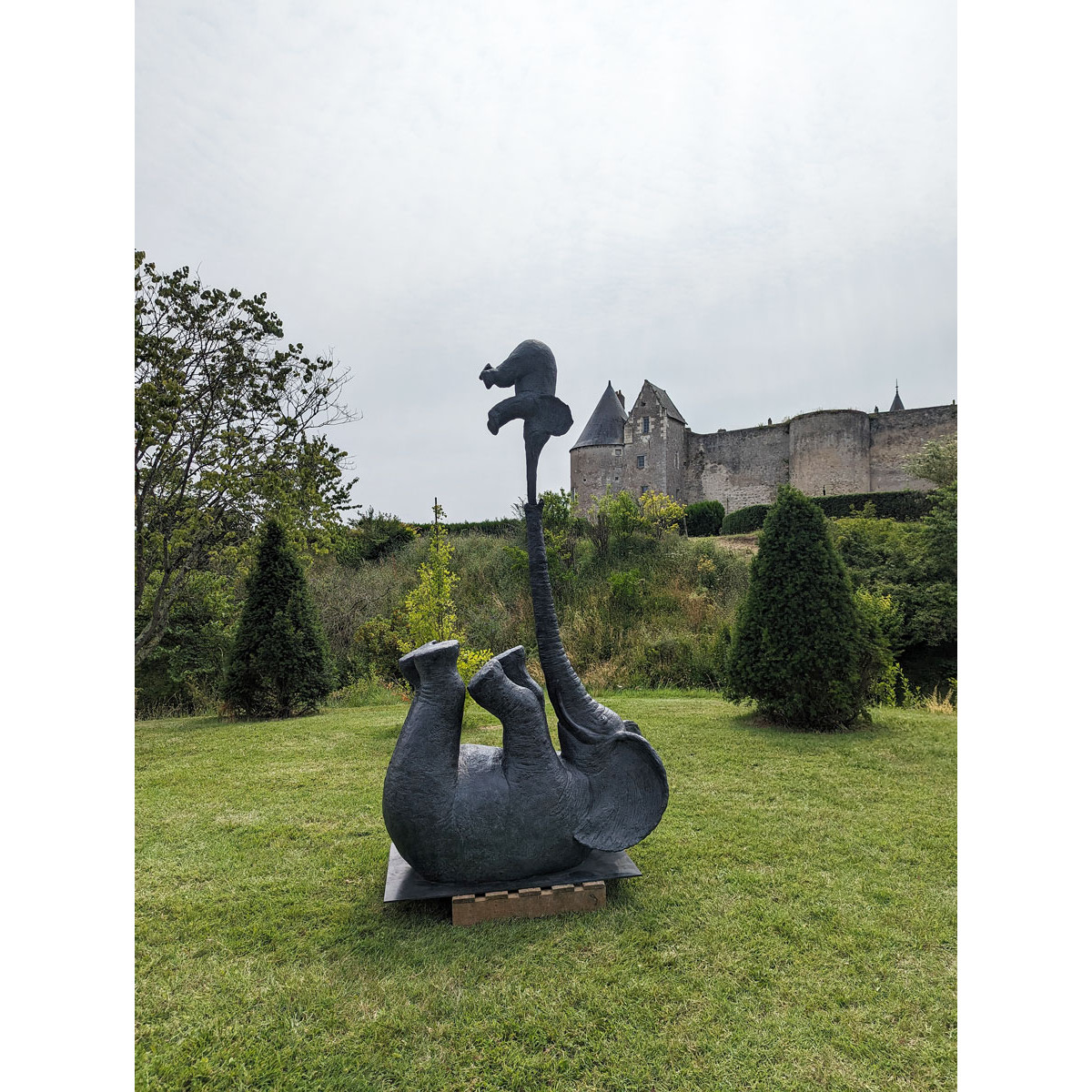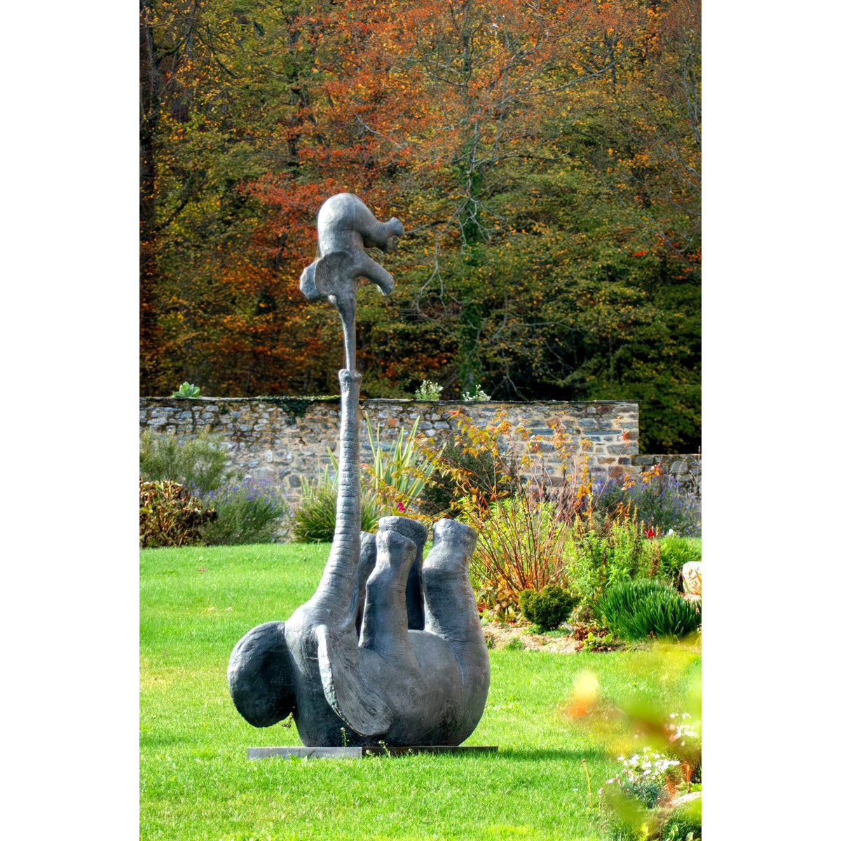 C’est une pièce emblématique de mon travail réalisée en très grand format. La rondeur de l’éléphant contraste avec la trompe dressée soutenant un éléphanteau, donnant une sensation de jeu et de dynamisme.